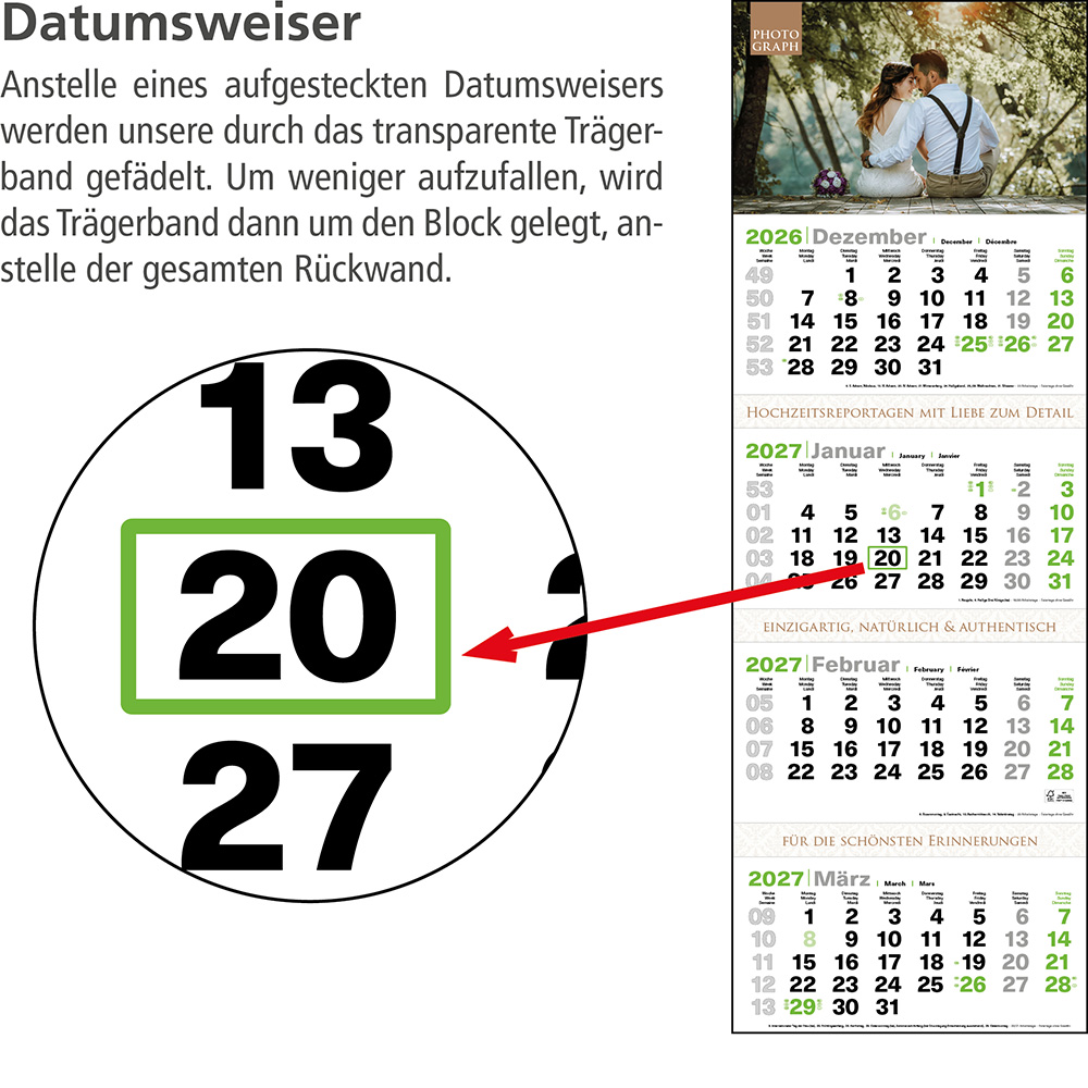 Das Klarsicht-Trägerband ist durch das Fenster (grün) des Datumsweisers hindurchgefädelt, um ein Abfallen des Fensters zu vermeiden. Der Datumsweiser ist um den Monatsblock (nicht den gesamten Kalender) umgelegt. Metallöse zum sicheren Aufhängen des Kalenders Microperforation der Monatsblöcke für ein rückstandsfreies und einfaches Abreißen der Blätter |