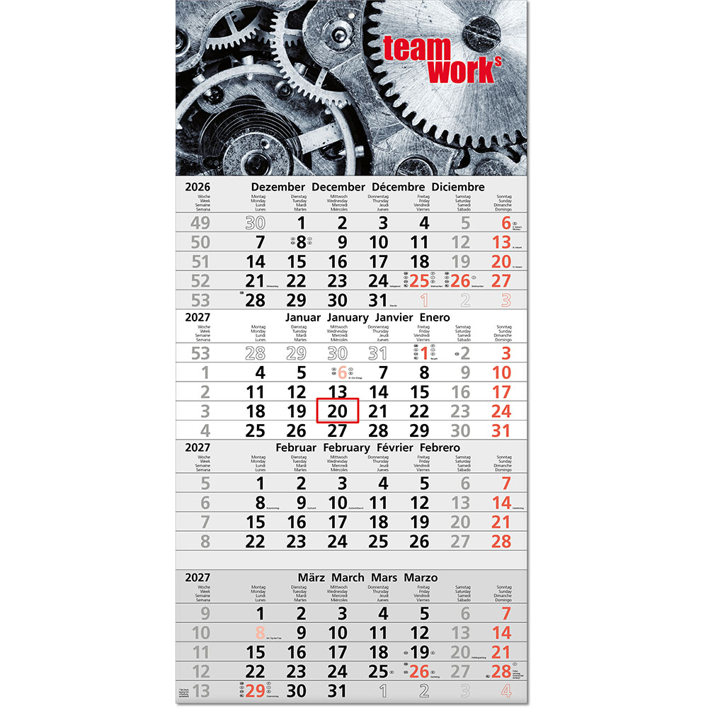 | Umfang | 1 Rückwand, 4 aufgeklebte Kalenderblöcke mit je 12 Monaten |